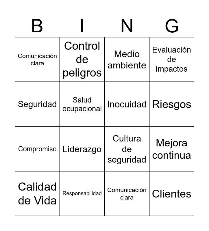 This bingo card has 16 words: Calidad de Vida, Responsabilidad, Medio ambiente, Evaluación de impactos, Seguridad, Control de peligros, Cultura de seguridad, Mejora continua, Comunicación clara, Salud ocupacional, Comunicación clara, Riesgos, Compromiso, Liderazgo, Inocuidad and Clientes.