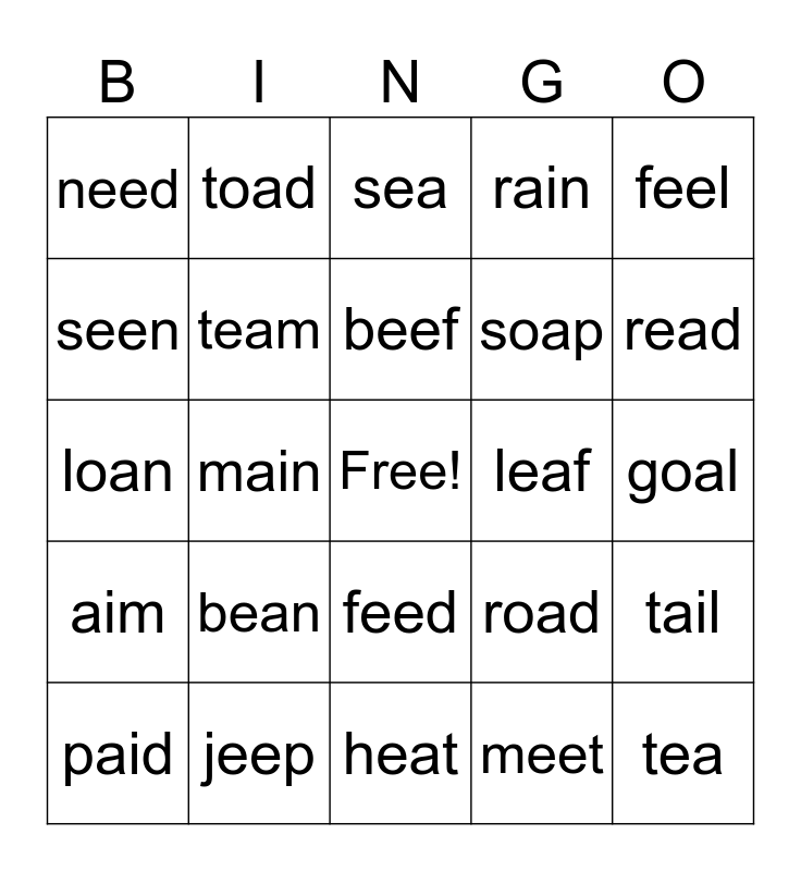 This bingo card has a free space and 26 words: feed, meet, beef, jeep, feel, need, seen, toad, goal, road, soap, loan, tail, paid, main, nail, rain, aim, sea, tea, read, heat, leaf, bean, team and seal.