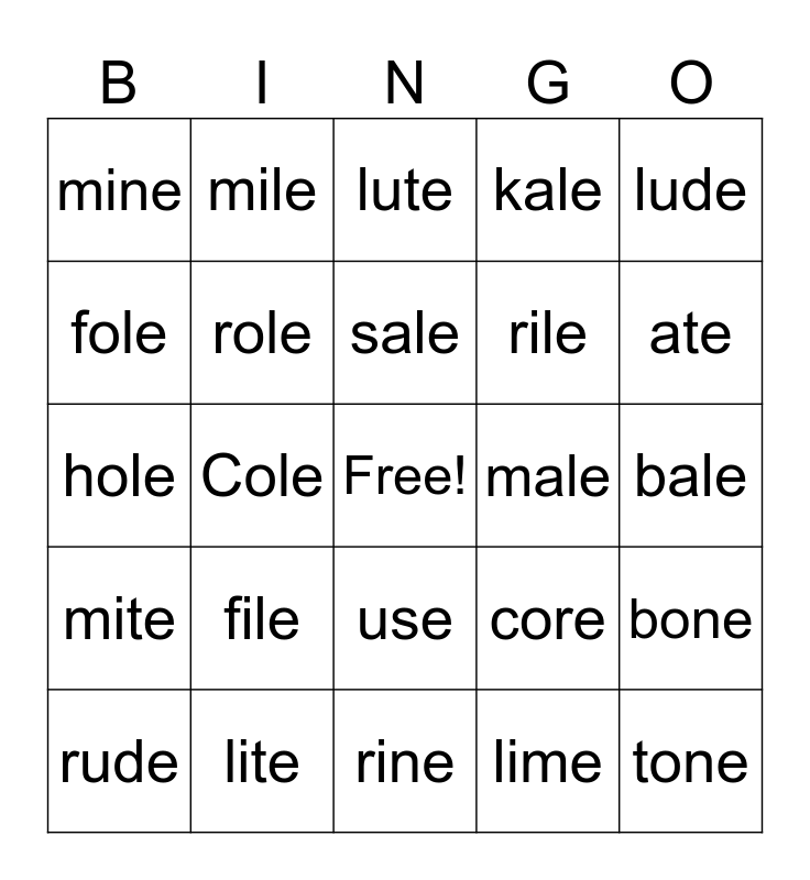 This bingo card has a free space and 24 words: rude, file, sale, lime, lude, mine, mile, lute, male, bale, hole, role, core, bone, fole, lite, rine, kale, ate, mite, Cole, use, rile and tone.