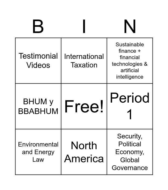 This bingo card has a free space and 19 words: The Master in Public Policy (MPP) Launch, GOOGLE, Sustainable finance + financial technologies & artificial intelligence, Master in International Development (MID), UCCI e ITU, Security, Political Economy, Global Governance, PoliSci Conversations, Testimonial Videos, International Taxation, ELSA, Non-lawyer profiles, Period 1, Environmental and Energy Law, Fordham y UCLA, Internship Stories and experiences, Queen Sofia Spanish Institute, BHUM y BBABHUM, North America and Bachelor in Humanities: Real Student Insights.