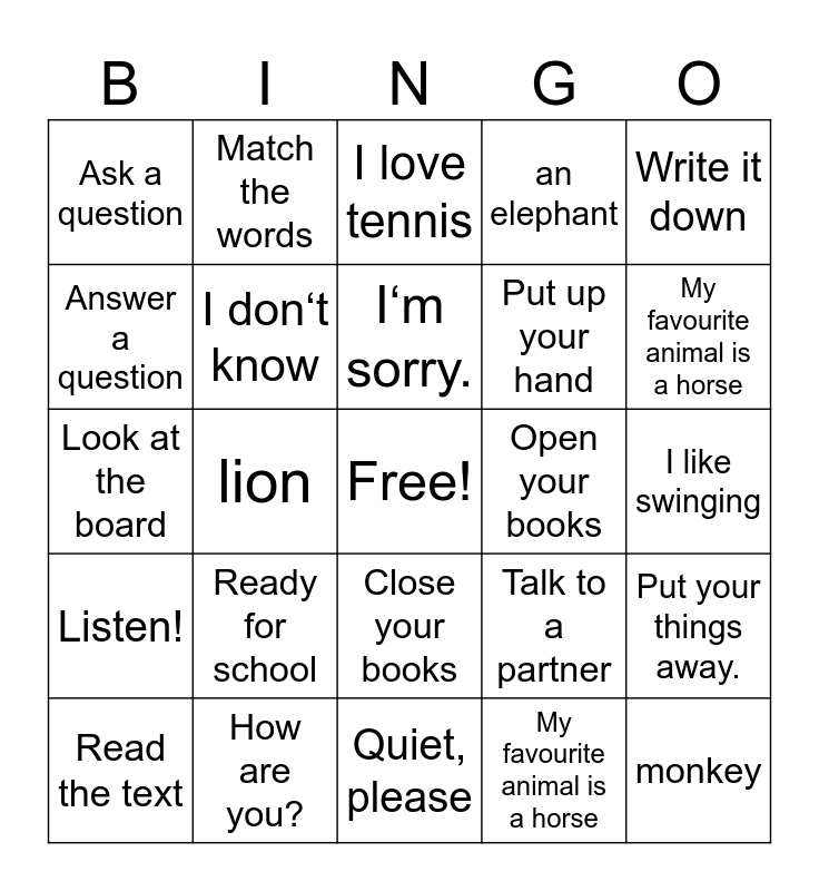 This bingo card has a free space and 25 words: Ready for school, Quiet, please, I‘m sorry., Read the text, Write it down, Ask a question, Answer a question, Match the words, Open your books, Close your books, Put up your hand, Look at the board, Talk to a partner, Put your things away., I don‘t know, I don‘t like dancing, I like swinging, I love tennis, My favourite animal is a horse, lion, monkey, How are you?, Listen!, an elephant and My favourite animal is a horse.