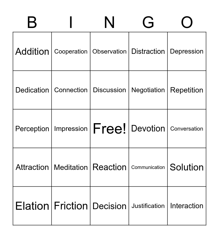 This bingo card has a free space and 73 words: Action, Accusation, Addition, Adaptation, Assertion, Assumption, Attraction, Compassion, Communication, Connection, Completion, Confusion, Connection, Conversation, Conviction, Cooperation, Decision, Dedication, Determination, Devotion, Discussion, Distraction, Depression, Education, Elation, Emotion, Evolution, Exclusion, Exploration, Expression, Friction, Frustration, Hesitation, Imagination, Impression, Inclusion, Integration, Intention, Interaction, Inspiration, Justification, Meditation, Miscommunication, Modification, Motivation, Negotiation, Observation, Obsession, Participation, Perception, Permission, Persuasion, Preparation, Progression, Protection, Question, Realization, Reaction, Reduction, Reflection, Regulation, Rejection, Relation, Repetition, Reservation, Resolution, Revision, Satisfaction, Solution, Subtraction, Tension, Transformation and Transition.