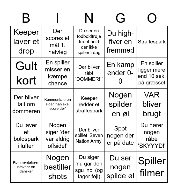 This bingo card has 25 words: Nogen siger ‘der var aldrig offside!', Du siger 'nu går den sgu ind' (og tager fejl), Der bliver råbt 'DOMMER!!', Kommentatoren nævner en dansker, Straffespark, Keeper laver et drop, Gult kort, Der scores et mål 1. halvleg, Nogen spilder en øl, Der bliver spillet 'Seven Nation Army', En kamp ender 0-0, Der bliver talt om dommeren, Spot nogen der er på date, Du hører nogen råbe 'SKYYYD!', En spiller misser en kæmpe chance, Spiller filmer, VAR bliver brugt, Du ser en fodboldtrøje fra et hold der ikke spiller i dag, En spiller ligger mere end 10 sek. på græsset, Kommentatoren siger 'han skal score der', Keeper redder et straffespark, Nogen bestiller shots, Du laver et boldspark i luften, Du high-fiver en fremmed and Du ser nogen spilde øl.