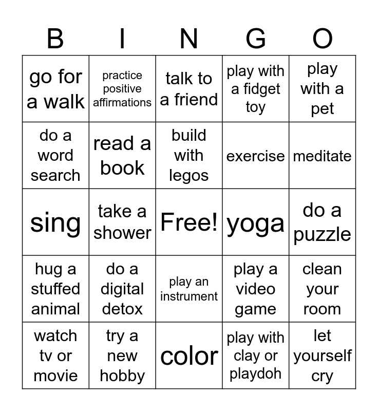 This bingo card has a free space and 29 words: watch tv or movie, go for a walk, take a shower, listen to music, go for a walk, talk to a friend, read a book, do a digital detox, yoga, try a new hobby, do a puzzle, let yourself cry, color, play with clay or playdoh, meditate, take a nap, play an instrument, hug a stuffed animal, play with a pet, sing, play a video game, smile at 5 people, exercise, do a word search, play with a fidget toy, practice positive affirmations, clean your room, build with legos and bake cookies.