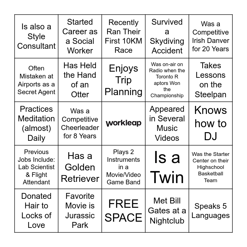 This bingo card has a free space and 24 words: Has a Golden Retriever, Favorite Movie is Jurassic Park, Enjoys Trip Planning, Donated Hair to Locks of Love, Was a Competitive Irish Danver for 20 Years, Is also a Style Consultant, Often Mistaken at Airports as a Secret Agent, Started Career as a Social Worker, Appeared in Several Music Videos, Plays 2 Instruments in a Movie/Video Game Band, Was on-air on Radio when the Toronto Raptors Won the Championship, Practices Meditation (almost) Daily, Is a Twin, Was the Starter Center on their Highschool Basketball Team, Has Held the Hand of an Otter, Met Bill Gates at a Nightclub, Knows how to DJ, Recently Ran Their First 10KM Race, Takes Lessons on the Steelpan, Was a Competitive Cheerleader for 8 Years, Speaks 5 Languages, Previous Jobs Include: Lab Scientist & Flight Attendant, Survived a Skydiving Accident and FREE SPACE.