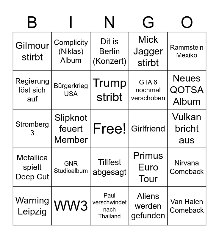This bingo card has a free space and 24 words: GNR Studioalbum, WW3, Trump stribt, Warning Leipzig, Rammstein Mexiko, Gilmour stirbt, Regierung löst sich auf, Complicity (Niklas) Album, Girlfriend, Tillfest abgesagt, GTA 6 nochmal verschoben, Stromberg 3, Primus Euro Tour, Nirvana Comeback, Bürgerkrieg USA, Aliens werden gefunden, Vulkan bricht aus, Dit is Berlin (Konzert), Neues QOTSA Album, Slipknot feuert Member, Van Halen Comeback, Metallica spielt Deep Cut, Mick Jagger stirbt and Paul verschwindet nach Thailand.