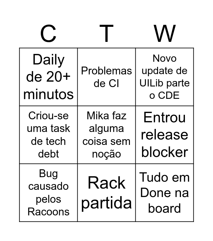This bingo card has a free space and 8 words: Entrou release blocker, Novo update de UILib parte o CDE, Problemas de CI, Bug causado pelos Racoons, Daily de 20+ minutos, Tudo em Done na board, Criou-se uma task de tech debt and Rack partida.