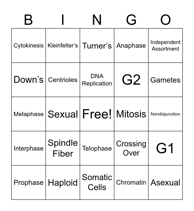 This bingo card has a free space and 28 words: G1, S, G2, Chromatin, Down’s, Turner’s, Kleinfelter’s, Interphase, Mitosis, Prophase, Metaphase, Anaphase, Haploid, Somatic Cells, Gametes, Chromosomes, Spindle Fiber, Centrioles, DNA Replication, Telophase, Cytokinesis, Meiosis, Asexual, Sexual, Nondisjunction, Crossing Over, Independent Assortment and Diploid.