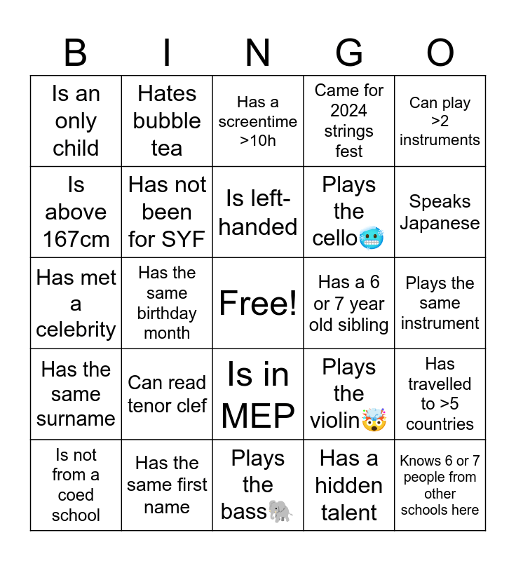 This bingo card has a free space and 27 words: Plays the violin🤯, Plays the viola 😎, Plays the cello🥶, Plays the bass🐘, Is above 167cm, Has a screentime >10h, Hates bubble tea, Has the same surname, Has a 6 or 7 year old sibling, Has travelled to >5 countries, Has met a celebrity, Came for 2024 strings fest, Is not from a coed school, Has the same first name, Speaks Japanese, Is not Singaporean, Has not been for SYF, Is left-handed, Can read tenor clef, Is an only child, Plays the same instrument, Has a hidden talent, Has the same birthday month, Knows 6 or 7 people from other schools here, Is in MEP, Can play >2 instruments and Stays in the same neighbourhood.