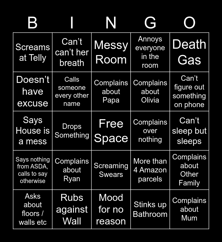 This bingo card has a free space and 24 words: Complains about Ryan, Rubs against Wall, Complains about Papa, Asks about floors / walls etc, Death Gas, Screams at Telly, Doesn’t have excuse, Can’t can’t her breath, Complains over nothing, Screaming Swears, Complains about Olivia, Says House is a mess, More than 4 Amazon parcels, Complains about Other Family, Calls someone every other name, Stinks up Bathroom, Can’t sleep but sleeps, Messy Room, Can’t figure out something on phone, Drops Something, Complains about Mum, Says nothing from ASDA, calls to say otherwise, Annoys everyone in the room and Mood for no reason.