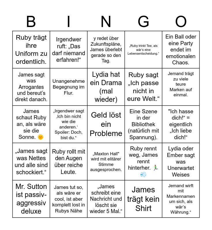This bingo card has a free space and 24 words: Ruby rollt mit den Augen über reiche Leute., James tut so, als wäre er cool, ist aber komplett lost in Rubys Nähe, Lydia hat ein Drama (mal wieder), Mr. Sutton ist passiv-aggressiv deluxe, Ein Ball oder eine Party endet im emotionalen Chaos., Ruby trägt ihre Uniform zu ordentlich., James sagt was Arrogantes und bereut’s direkt danach., Irgendwer ruft: „Das darf niemand erfahren!“, Eine Szene in der Bibliothek (natürlich mit Spannung)., „Maxton Hall" wird mit elitärer Stimme ausgesprochen., Ruby sagt „Ich passe nicht in eure Welt.“, James schaut Ruby an, als wäre sie die Sonne. 🌞, Ruby rennt weg, James rennt hinterher. 🏃♂️💨, Lydia oder Ember sagt was Unerwartet Weises, Unangenehme Begegnung im Flur., James trägt kein Shirt, "Ich hasse dich!“ = eigentlich „Ich liebe dich!“, y redet über Zukunftspläne, James überlebt gerade so den Tag., Jemand trägt zu viele teure Marken auf einmal., „Irgendwer sagt ‚Ich bin nicht wie die anderen.‘ Spoiler: Doch, bist du.“, Jemand wirft mit Markennamen um sich, als wär’s Währung.“, „James sagt was Nettes und alle sind schockiert.“, „Ruby trinkt Tee, als wär’s eine Lebensentscheidung.“ and „James schreibt eine Nachricht und löscht sie wieder 5 Mal.“.