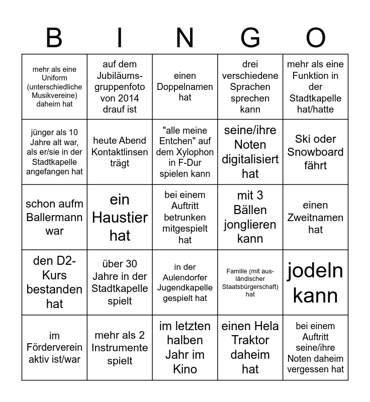 This bingo card has a free space and 24 words: über 30 Jahre in der Stadtkapelle spielt, mehr als 2 Instrumente spielt, "alle meine Entchen" auf dem Xylophon in F-Dur spielen kann, im Förderverein aktiv ist/war, mehr als eine Funktion in der Stadtkapelle hat/hatte, mehr als eine Uniform (unterschiedliche Musikvereine) daheim hat, jünger als 10 Jahre alt war, als er/sie in der Stadtkapelle angefangen hat, auf dem Jubiläums-gruppenfoto von 2014 drauf ist, mit 3 Bällen jonglieren kann, in der Aulendorfer Jugendkapelle gespielt hat, seine/ihre Noten digitalisiert hat, schon aufm Ballermann war, Familie (mit aus-ländischer Staatsbürgerschaft) hat, jodeln kann, heute Abend Kontaktlinsen trägt, einen Hela Traktor daheim hat, einen Zweitnamen hat, einen Doppelnamen hat, Ski oder Snowboard fährt, ein Haustier hat, bei einem Auftritt seine/ihre Noten daheim vergessen hat, den D2-Kurs bestanden hat, drei verschiedene Sprachen sprechen kann and im letzten halben Jahr im Kino.
