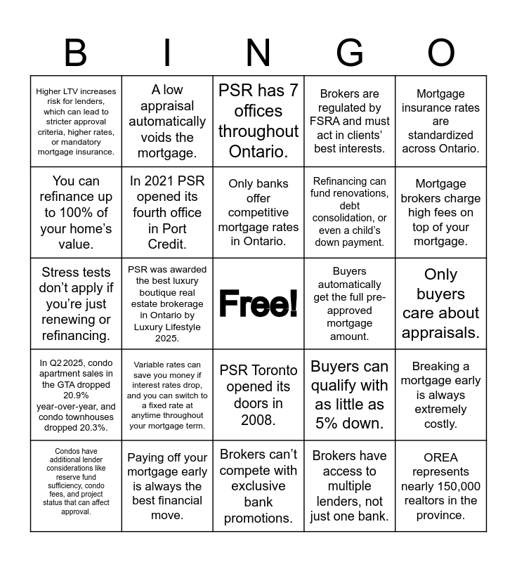 This bingo card has a free space and 24 words: Variable rates can save you money if interest rates drop, and you can switch to a fixed rate at anytime throughout your mortgage term., Paying off your mortgage early is always the best financial move., Only banks offer competitive mortgage rates in Ontario., Condos have additional lender considerations like reserve fund sufficiency, condo fees, and project status that can affect approval., Mortgage insurance rates are standardized across Ontario., Higher LTV increases risk for lenders, which can lead to stricter approval criteria, higher rates, or mandatory mortgage insurance., You can refinance up to 100% of your home’s value., A low appraisal automatically voids the mortgage., Buyers automatically get the full pre-approved mortgage amount., PSR Toronto opened its doors in 2008., Refinancing can fund renovations, debt consolidation, or even a child’s down payment., Stress tests don’t apply if you’re just renewing or refinancing., Buyers can qualify with as little as 5% down., Breaking a mortgage early is always extremely costly., In 2021 PSR opened its fourth office in Port Credit., Brokers have access to multiple lenders, not just one bank., Only buyers care about appraisals., PSR has 7 offices throughout Ontario., Mortgage brokers charge high fees on top of your mortgage., PSR was awarded the best luxury boutique real estate brokerage in Ontario by Luxury Lifestyle 2025., OREA represents nearly 150,000 realtors in the province., In Q2 2025, condo apartment sales in the GTA dropped 20.9% year‑over‑year, and condo townhouses dropped 20.3%., Brokers are regulated by FSRA and must act in clients’ best interests. and Brokers can’t compete with exclusive bank promotions..