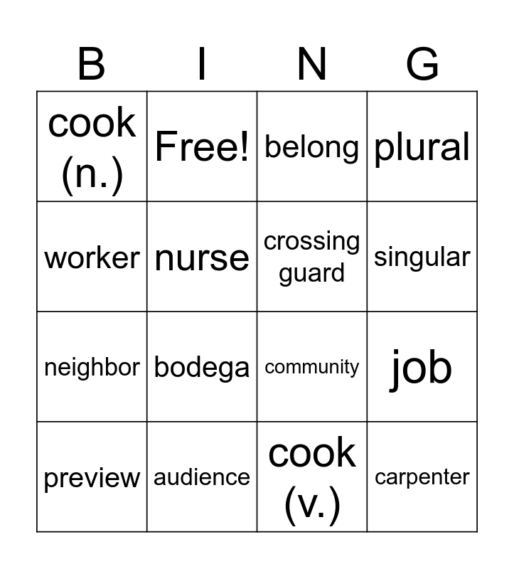This bingo card has 19 words: community, seamstress, belong, carpenter, job, worker, cook (v.), cook (n.), Free!, neighbor, bodega, nurse, crossing guard, audience, preview, prediction, plural, singular and multiple.