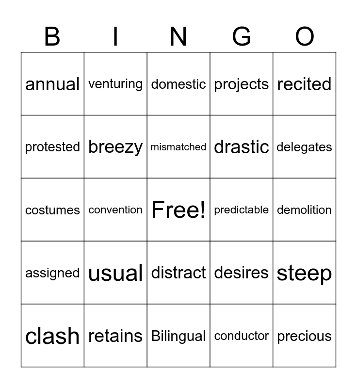 This bingo card has a free space and 25 words: usual, Bilingual, mismatched, clash, recited, annual, protested, venturing, predictable, distract, drastic, costumes, desires, steep, breezy, mosaics, demolition, domestic, delegates, convention, precious, retains, assigned, projects and conductor.
