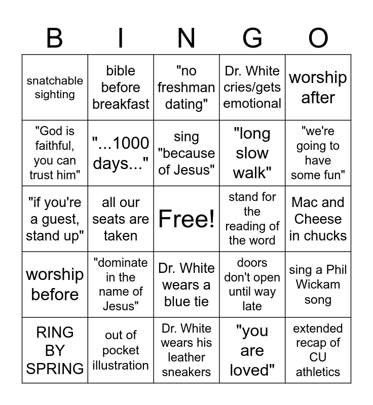 This bingo card has a free space and 24 words: "dominate in the name of Jesus", out of pocket illustration, sing "because of Jesus", RING BY SPRING, worship after, snatchable sighting, "God is faithful, you can trust him", bible before breakfast, stand for the reading of the word, Dr. White wears a blue tie, "long slow walk", "if you're a guest, stand up", doors don't open until way late, sing a Phil Wickam song, "...1000 days...", "you are loved", Mac and Cheese in chucks, "no freshman dating", "we're going to have some fun", all our seats are taken, extended recap of CU athletics, worship before, Dr. White cries/gets emotional and Dr. White wears his leather sneakers.