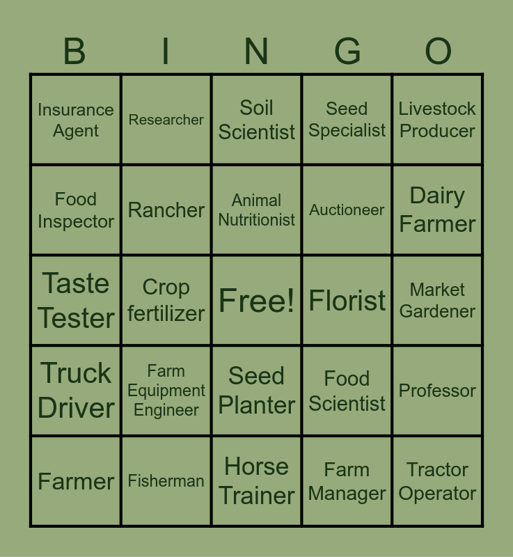 This bingo card has a free space and 29 words: Farmer, Veterinarian, Crop fertilizer, Bee Keeper, Insurance Agent, Soil Scientist, Rancher, Farm Equipment Engineer, Florist, Fisherman, Market Gardener, Tractor Operator, Horse Trainer, Farm Manager, Dairy Farmer, Poultry Farmer, Seed Planter, Truck Driver, Livestock Producer, Taste Tester, Food Scientist, Farm Manager, Auctioneer, Food Inspector, Seed Specialist, Researcher, Professor, Animal Nutritionist and Baker.