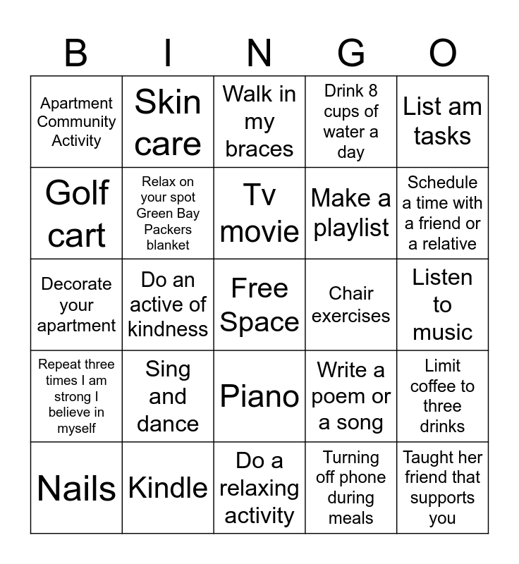 This bingo card has a free space and 24 words: Sing and dance, Kindle, Tv movie, Nails, List am tasks, Apartment Community Activity, Golf cart, Skin care, Chair exercises, Piano, Make a playlist, Decorate your apartment, Write a poem or a song, Limit coffee to three drinks, Relax on your spot Green Bay Packers blanket, Turning off phone during meals, Listen to music, Walk in my braces, Schedule a time with a friend or a relative, Do an active of kindness, Taught her friend that supports you, Repeat three times I am strong I believe in myself, Drink 8 cups of water a day and Do a relaxing activity.