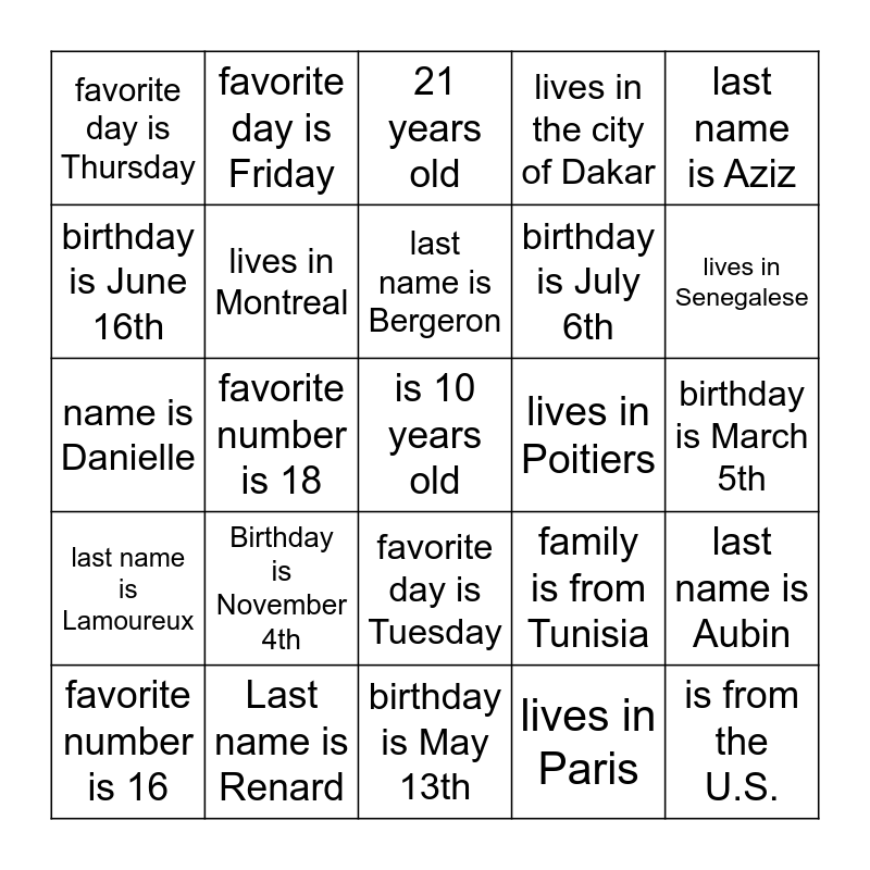This bingo card has 99 words: Free!, nickname is Loulou, is from Martinique, 21 years old, nickname is nat, birthday is December 12th, birthday is March 18th, favorite season is fall, favorite season is summer, favorite season is spring, favorite season is winter, favorite number is 13, favorite day is Monday, favorite day is Tuesday, favorite day is Wednesday, favorite day is Thursday, favorite day is Friday, favorite day is Saturday, favorite day is Sunday, favorite number is 8, is 30 years old, birthday is September 9th, lives in Luxembourg, family is from Germany, favorite number is 9, last name is Aubin, last name is Bergeron, last name is Desmarais, nickname is Dubi, is 16 years old, birthday is May 13th, lives in Paris, from France, family is from Morocco, favorite number is 18, name is Danielle, name is Aisha, is 7 years old, is 24 years old, Birthday is November 4th, family is from Algeria, lives in Senegalese, lives in the city of Dakar, Last name is Renard, Nickname is Mo, lives in Dijon, family is from England, nickname is Coco, is 19 years old, birthday is June 20th, family is from Haiti, is 10 years old, family is from Tunisia, favorite number is 20, family name is Joof, family is from the Ivory Coast, favorite number is 17, last name is Bourque, birthday is September 4th, lives in Haiti, family is creole, is 25 years old, nickname is Le Loup, lives in Nice, family is from the Congo, last name is Aziz, is 13 years old, lives in Rabat, lives in Morocco, last name is Lamoureux, is 33 years old, birthday is July 6th, birthday is June 16th, family comes from Switzerland, lives in Québec, family is from Lebanon, lives in Montreal, birthday is November 11th, nickname is JP, family is from Greece, lives in Poitiers, nickname is Juju, nickname is Ric, is 29 years old, lives in Bern, family is from Norway, nickname is Pistache, lives in Ottawa, birthday is March 5th, favorite number is 16, nickname is Tophe, is 11 years old, is from the U.S., birthday is February 28th, lives in Brussels, lives in Belgium, family is from Mali, birthday is October 10th and favorite number is 5.