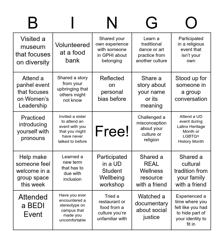 This bingo card has a free space and 24 words: Attended a BEDI Event, Learned a new term that has to due with inclusion, Reflected on personal bias before, Watched a documentary about social justice, Participated in a religious event that isn’t your own, Visited a museum that focuses on diversity, Volunteered at a food bank, Shared your own experience with someone in GPHI about belonging, Challenged a misconception about your culture or religion, Attend a UD event during Latinx Heritage Month or LGBTQ+ History Month, Practiced introducing yourself with pronouns, Shared a story from your upbringing that others might not know, Shared a REAL Wellness resource with a friend, Shared a cultural tradition from your family with a friend, Attend a panhel event that focuses on Women’s Leadership, Have you ever encountered a stereotype on campus that made you uncomfortable, Tried a restaurant or food from a culture you’re unfamiliar with, Learn a traditional dance or art practice from another culture, Stood up for someone in a group conversation, Help make someone feel welcome in a group space this week, Invited a sister to attend an event with you that you might have never talked to before, Participated in a UD Student Wellbeing workshop, Share a story about your name or its meaning and Experienced a time where you felt like you had to hide part of your identity to fit in.