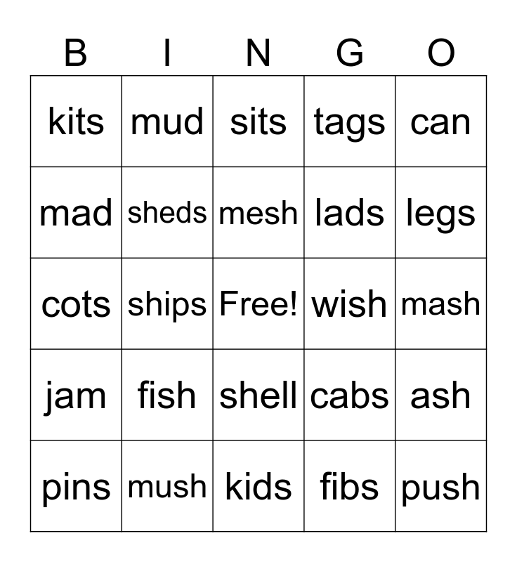 This bingo card has a free space and 29 words: pins, ribs, ships, fits, kits, sits, sheds, fish, wish, mush, mash, push, kids, fibs, legs, zips, shell, jam, can, cots, cabs, fads, lads, mad, tags, mud, ash, mesh and lash.