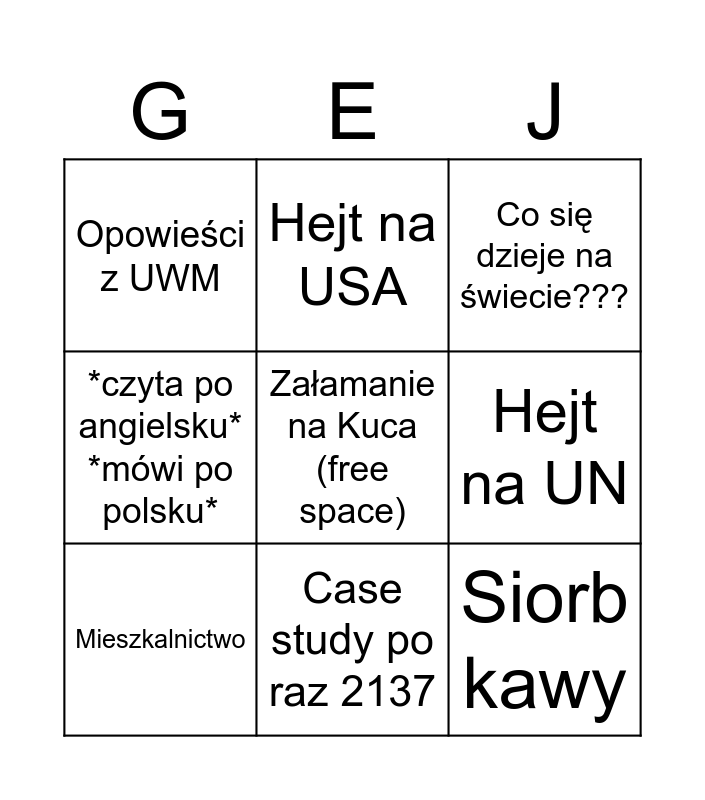 This bingo card has a free space and 8 words: Hejt na UN, Co się dzieje na świecie???, Hejt na USA, Mieszkalnictwo, Opowieści z UWM, Siorb kawy, *czyta po angielsku* *mówi po polsku* and Case study po raz 2137.