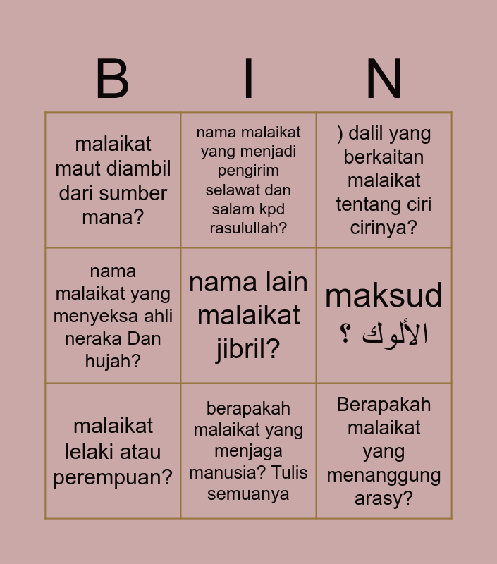 This bingo card has a free space and 8 words: nama malaikat yang menyeksa ahli neraka Dan hujah?, nama malaikat yang menjadi pengirim selawat dan salam kpd rasulullah?, maksud الألوك ؟, malaikat lelaki atau perempuan?, ) dalil yang berkaitan malaikat tentang ciri cirinya?, malaikat maut diambil dari sumber mana?, berapakah malaikat yang menjaga manusia? Tulis semuanya and Berapakah malaikat yang menanggung arasy?.