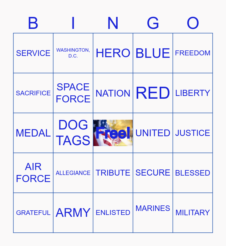 This bingo card has a free space and 59 words: FLAG, ARMY, NAVY, AIR FORCE, MARINES, COAST GUARD, SPACE FORCE, PATRIOTS, RED, WHITE, BLUE, AMERICAN PRIDE, SACRIFICE, SALUTE, TAPS, SERVICE, MILITARY, FREEDOM, TRIUMPH, NATION, UNITED, HERO, GRATEFUL, BLESSED, COURAGE, BRAVE, COMMITMENT, INSPIRING, LIBERTY, VALOR, THANKFUL, POPPY, MIA, KIA, WASHINGTON, D.C., SUPPORT, BUGLE, DOG TAGS, WELCOME HOME, MEDAL, REMEMBER, ALLEGIANCE, JUSTICE, RESPECT, SOLDIER, VETERAN, PARADE, TROOPS, TRIBUTE, ENLISTED, PROTECT, NOVEMBER, MEMORIAL, SAILORS, SAFE, SECURE, PEACE, PRAYER and WAR.