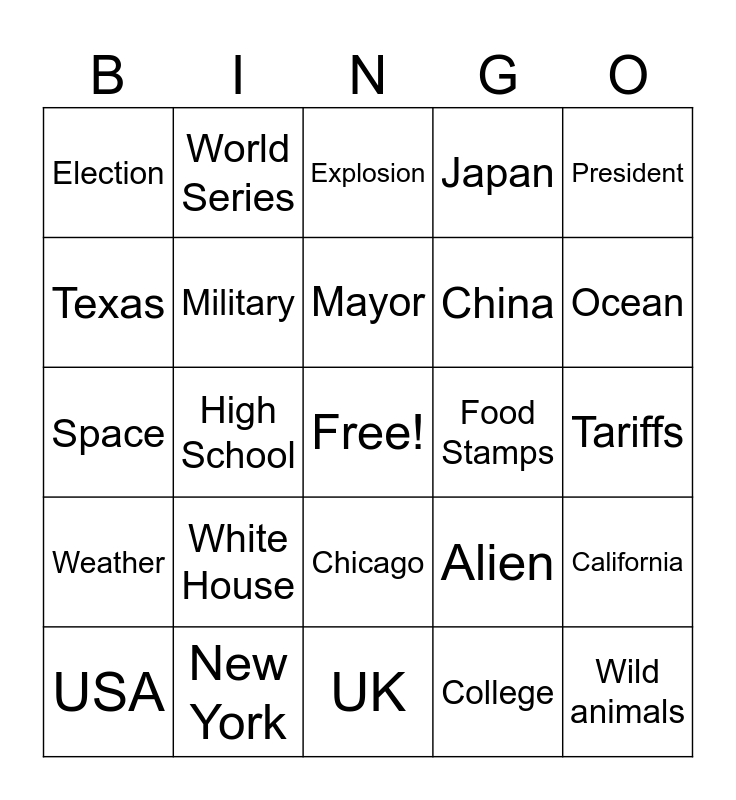 This bingo card has a free space and 24 words: White House, New York, Mayor, USA, President, Election, Texas, World Series, Food Stamps, Chicago, China, Space, Alien, California, Military, College, Tariffs, Explosion, Ocean, High School, Wild animals, Weather, Japan and UK.