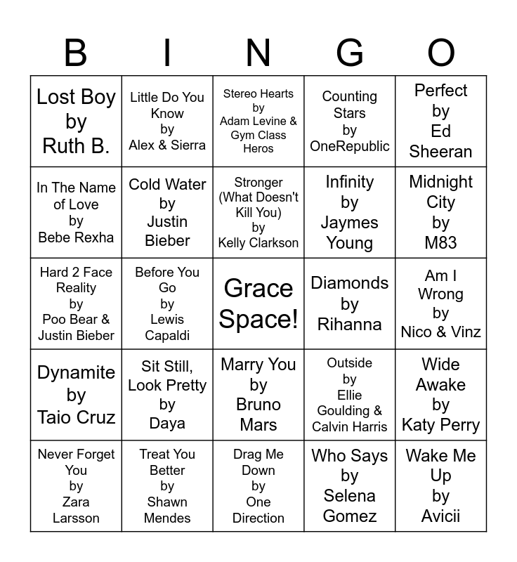 This bingo card has a free space and 24 words: Sit Still, Look Pretty by Daya, Treat You Better by Shawn Mendes, Stronger (What Doesn't Kill You) by Kelly Clarkson, Never Forget You by Zara Larsson, Perfect by Ed Sheeran, Lost Boy by Ruth B., In The Name of Love by Bebe Rexha, Little Do You Know by Alex & Sierra, Diamonds by Rihanna, Marry You by Bruno Mars, Infinity by Jaymes Young, Hard 2 Face Reality by Poo Bear & Justin Bieber, Outside by Ellie Goulding & Calvin Harris, Wide Awake by Katy Perry, Cold Water by Justin Bieber, Who Says by Selena Gomez, Am I Wrong by Nico & Vinz, Stereo Hearts by Adam Levine & Gym Class Heros, Midnight City by M83, Before You Go by Lewis Capaldi, Wake Me Up by Avicii, Dynamite by Taio Cruz, Counting Stars by OneRepublic and Drag Me Down by One Direction.