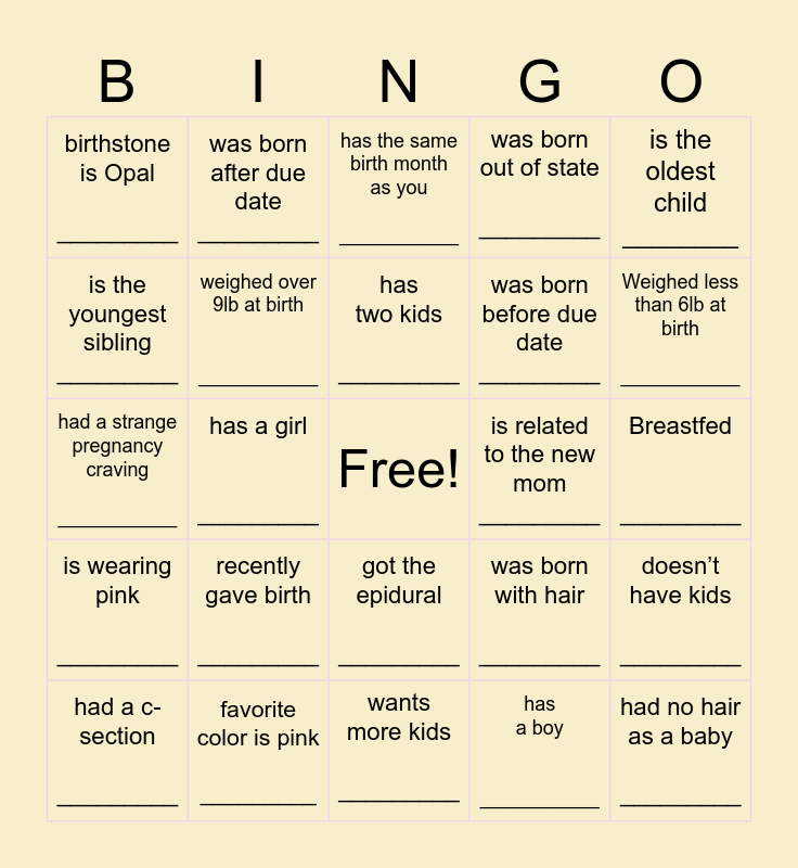 This bingo card has a free space and 24 words: recently gave birth _________, favorite color is pink _________, has two kids _________, had a c-section _________, is the oldest child ________, birthstone is Opal _________, is the youngest sibling _________, was born after due date _________, is related to the new mom _________, got the epidural _________, was born before due date _________, had a strange pregnancy craving ___________, was born with hair _________, doesn’t have kids _________, weighed over 9lb at birth ___________, has a boy ___________, Breastfed _________, has the same birth month as you ___________, Weighed less than 6lb at birth ___________, has a girl _________, had no hair as a baby _________, is wearing pink _________, was born out of state _________ and wants more kids _________.