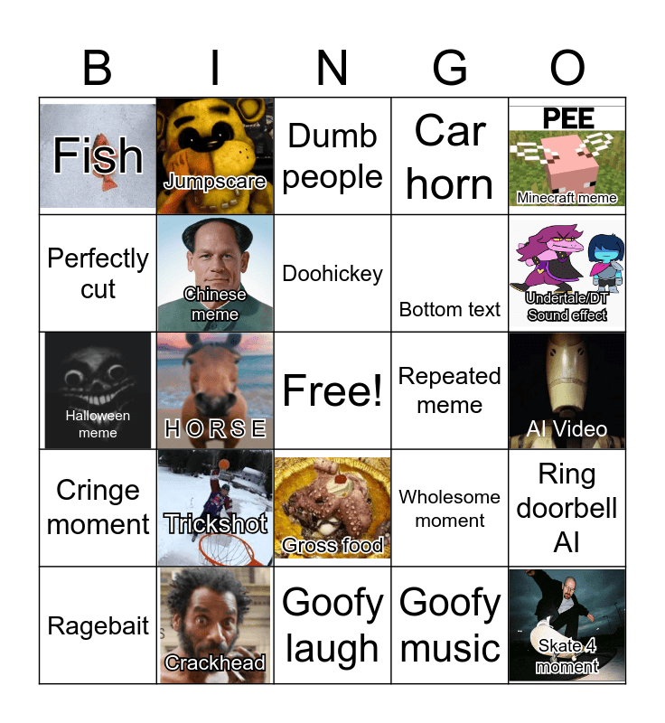 This bingo card has 12 images, a free space and 24 words: Trickshot, Crackhead, Doohickey, Ragebait, Minecraft meme, Fish, Perfectly cut, Jumpscare, Repeated meme, Gross food, Bottom text, Halloween meme, Wholesome moment, Ring doorbell AI, Chinese meme, Goofy music, AI Video, Dumb people, Undertale/DT Sound effect, H O R S E, Skate 4 moment, Cringe moment, Car horn and Goofy laugh.