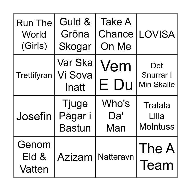 This bingo card has 20 words: Tralala Lilla Molntuss, Bad Habits, Take A Chance On Me, Här Kommer Alla Känslorna, Genom Eld & Vatten, Trettifyran, Azizam, Run The World (Girls), Josefin, Guld & Gröna Skogar, Tjuge Pågar i Bastun, Who's Da' Man, Var Ska Vi Sova Inatt, The A Team, Vem E Du, Vill Du Bli Min Fru, Det Snurrar I Min Skalle, LOVISA, Natteravn and Emergency.