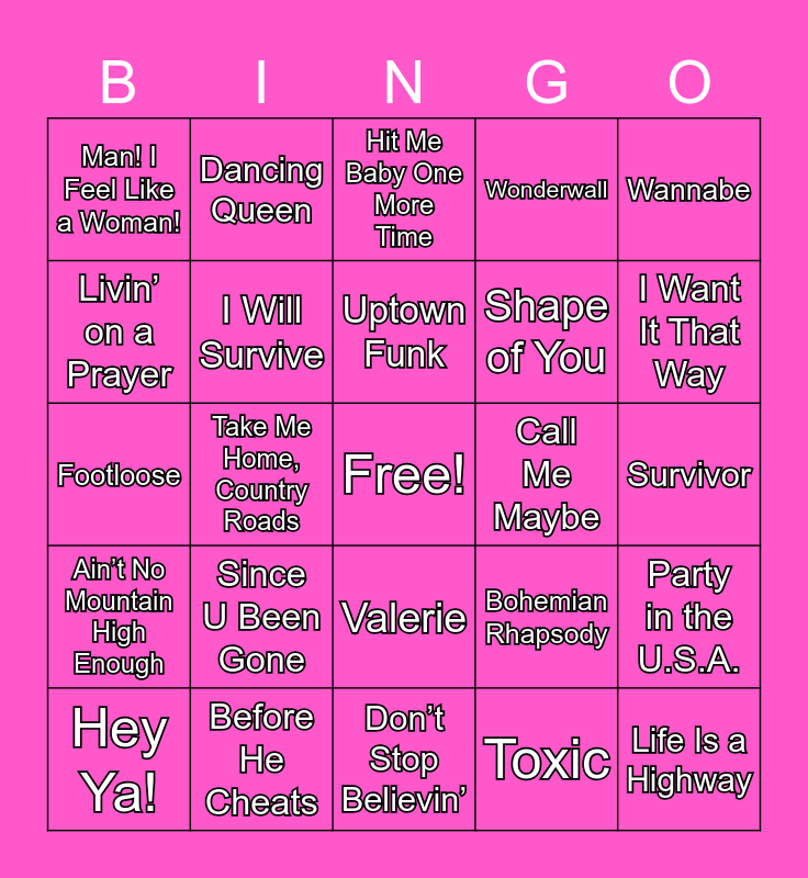 This bingo card has a free space and 49 words: Shut Up and Drive, Life Is a Highway, Sweet Caroline, Don’t Stop Believin’, Since U Been Gone, I Wanna Dance With Somebody, Dancing Queen, Mr. Brightside, Livin’ on a Prayer, Shallow, I Will Survive, Wonderwall, Party in the U.S.A., Bohemian Rhapsody, Rolling in the Deep, I Love Rock ’n’ Roll, Uptown Funk, Call Me Maybe, Don’t Go Breaking My Heart, Wannabe, Take Me Home, Country Roads, Toxic, Man! I Feel Like a Woman!, Shape of You, You Belong With Me, I Want It That Way, Hey Ya!, I’m Gonna Be (500 Miles), Valerie, Ain’t No Mountain High Enough, Bad Romance, Tennessee Whiskey, Levitating, Respect, Before He Cheats, Shake It Off, Jessie’s Girl, Africa, Survivor, Friends in Low Places, All Star, Say My Name, Roar, Summer of ’69, Footloose, Hit Me Baby One More Time, American Pie, Don’t Stop Me Now and Raise Your Glass.