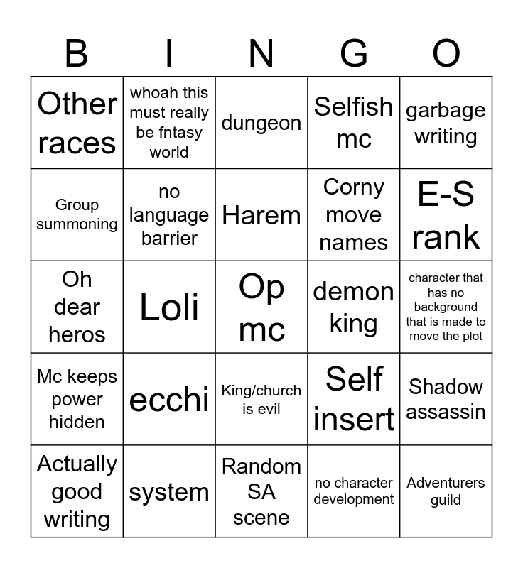 This bingo card has a free space and 24 words: ecchi, system, Harem, Actually good writing, garbage writing, Other races, Group summoning, whoah this must really be fntasy world, demon king, King/church is evil, Corny move names, Oh dear heros, Self insert, Shadow assassin, no language barrier, no character development, character that has no background that is made to move the plot, dungeon, E-S rank, Loli, Adventurers guild, Mc keeps power hidden, Selfish mc and Random SA scene.