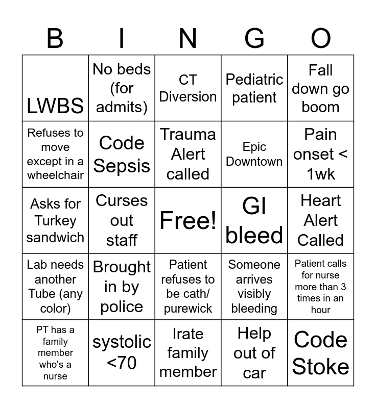 This bingo card has a free space and 24 words: Brought in by police, systolic <70, Trauma Alert called, PT has a family member who's a nurse, Fall down go boom, LWBS, Refuses to move except in a wheelchair, No beds (for admits), GI bleed, Patient refuses to be cath/ purewick, Epic Downtown, Asks for Turkey sandwich, Someone arrives visibly bleeding, Patient calls for nurse more than 3 times in an hour, Code Sepsis, Help out of car, Heart Alert Called, CT Diversion, Pain onset < 1wk, Curses out staff, Code Stoke, Lab needs another Tube (any color), Pediatric patient and Irate family member.