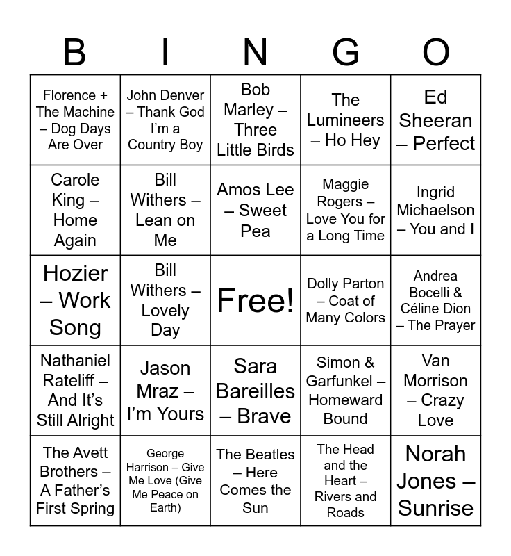 This bingo card has a free space and 50 words: Louis Armstrong – What a Wonderful World, Norah Jones – Sunrise, Jack Johnson – Better Together, The Beatles – Here Comes the Sun, Jason Mraz – I’m Yours, Ben Rector – Thank You, John Denver – Thank God I’m a Country Boy, Israel Kamakawiwoʻole – Somewhere Over the Rainbow / What a Wonderful World, Carole King – Home Again, James Taylor – Shower the People, Bill Withers – Lean on Me, The Lumineers – Ho Hey, Van Morrison – Crazy Love, Simon & Garfunkel – Homeward Bound, Fleetwood Mac – Landslide, The Chicks – Lullaby, Amos Lee – Sweet Pea, Dolly Parton – Coat of Many Colors, Ray LaMontagne – You Are the Best Thing, Ed Sheeran – Perfect, Bill Withers – Lovely Day, The Head and the Heart – Rivers and Roads, Florence + The Machine – Dog Days Are Over, Maggie Rogers – Love You for a Long Time, Coldplay – Strawberry Swing, Vance Joy – Riptide, Ingrid Michaelson – You and I, Paul Simon – You Can Call Me Al, Bob Marley – Three Little Birds, Sara Bareilles – Brave, Adele – Make You Feel My Love, Ben E. King – Stand by Me, Stevie Wonder – As, Norah Jones – Come Away With Me, George Harrison – Give Me Love (Give Me Peace on Earth), Brandi Carlile – The Story, Mavis Staples – You Are Not Alone, Cat Stevens – Peace Train, Bob Dylan – Forever Young, Andrea Bocelli & Céline Dion – The Prayer, Iron & Wine – Upward Over the Mountain, Sufjan Stevens – The Only Thing, Bon Iver – Holocene, John Mayer – Stop This Train, The Avett Brothers – A Father’s First Spring, Hozier – Work Song, Gregory Alan Isakov – The Stable Song, Caamp – By and By, Nathaniel Rateliff – And It’s Still Alright and Ray Charles – Hallelujah, I Love Her So.