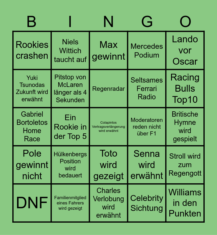 This bingo card has 25 words: Hülkenbergs Position wird bedauert, Charles Verlobung wird erwähnt, Regenradar, DNF, Lando vor Oscar, Rookies crashen, Yuki Tsunodas Zukunft wird erwähnt, Niels Wittich taucht auf, Moderatoren reden nicht über F1, Toto wird gezeigt, Seltsames Ferrari Radio, Gabriel Bortoletos Home Race, Senna wird erwähnt, Stroll wird zum Regengott, Pitstop von McLaren länger als 4 Sekunden, Williams in den Punkten, Britische Hymne wird gespielt, Max gewinnt, Racing Bulls Top10, Ein Rookie in der Top 5, Colapintos Vertragsverlängerung wird erwähnt, Familienmitglied eines Fahrers wird gezeigt, Pole gewinnt nicht, Mercedes Podium and Celebrity Sichtung.