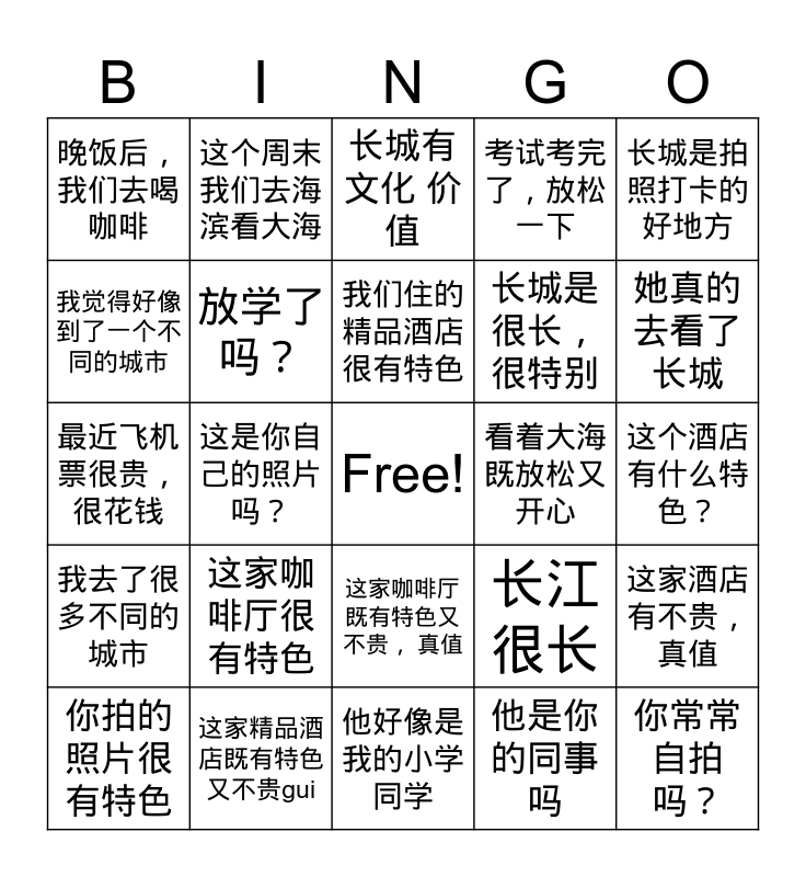 This bingo card has a free space and 24 words: 这家咖啡厅很有特色, 这家精品酒店既有特色又不贵gui, 我们住的精品酒店很有特色, 你拍的照片很有特色, 长城是拍照打卡的好地方, 晚饭后,我们去喝咖啡, 我觉得好像到了一个不同的城市, 这个周末我们去海滨看大海, 看着大海既放松又开心, 这家咖啡厅既有特色又不贵, 真值, 长城是很长, 很特别, 最近飞机票很贵,很花钱, 长江很长, 这家酒店有不贵,真值, 放学了吗?, 他是你的同事吗, 这个酒店有什么特色?, 长城有文化 价值, 她真的去看了长城, 这是你自己的照片吗?, 你常常自拍吗?, 我去了很多不同的城市, 考试考完了,放松一下 and 他好像是我的小学同学.