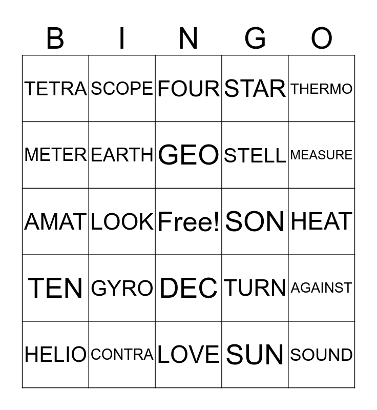 This bingo card has a free space and 24 words: GYRO, CONTRA, GEO, HELIO, THERMO, TETRA, METER, SCOPE, SON, DEC, STELL, AMAT, TURN, AGAINST, EARTH, SUN, HEAT, FOUR, MEASURE, LOOK, SOUND, TEN, STAR and LOVE.