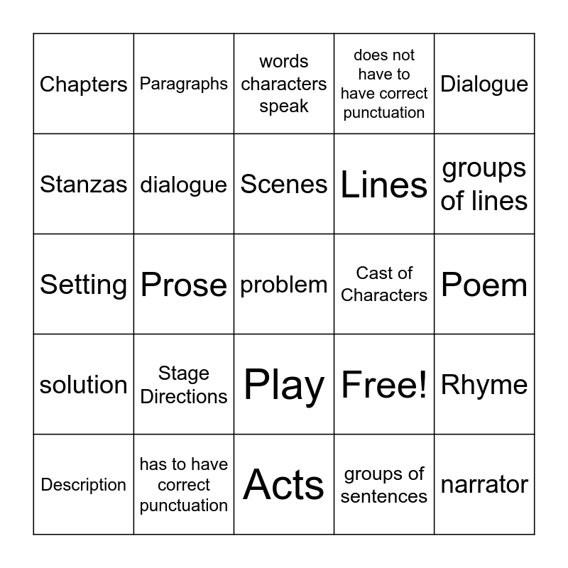 This bingo card has 25 words: Stage Directions, Acts, Scenes, Description, Dialogue, Chapters, Stanzas, Paragraphs, Cast of Characters, Play, Lines, Setting, Free!, Rhyme, dialogue, narrator, Poem, words characters speak, groups of lines, Prose, problem, has to have correct punctuation, solution, does not have to have correct punctuation and groups of sentences.