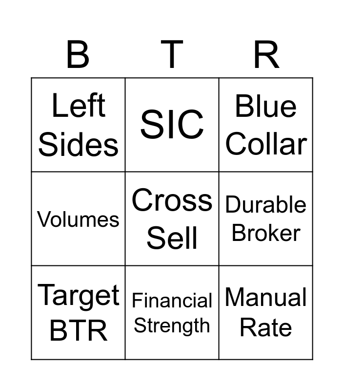 This bingo card has a free space and 8 words: Durable Broker, Blue Collar, SIC, Target BTR, Left Sides, Manual Rate, Volumes and Financial Strength.