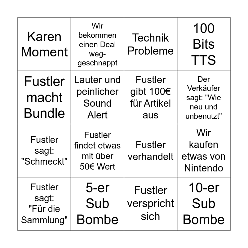 This bingo card has 16 words: 5-er Sub Bombe, Wir kaufen etwas von Nintendo, Technik Probleme, Karen Moment, Fustler sagt: "Schmeckt", Wir bekommen einen Deal weg- geschnappt, Fustler verhandelt, Fustler verspricht sich, Fustler macht Bundle, Lauter und peinlicher Sound Alert, Fustler sagt: "Für die Sammlung", 100 Bits TTS, Fustler findet etwas mit über 50€ Wert, Der Verkäufer sagt: "Wie neu und unbenutzt", Fustler gibt 100€ für Artikel aus and 10-er Sub Bombe.
