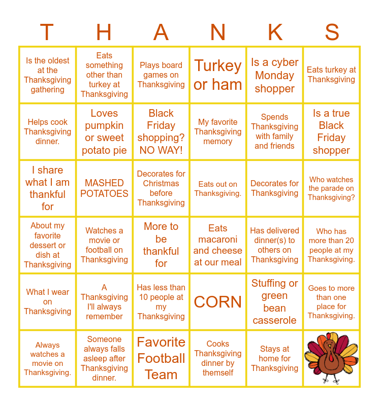 This bingo card has 1 images and 41 words: Stays at home for Thanksgiving, Loves pumpkin or sweet potato pie, The Thanksgiving food I don't like, Decorates for Thanksgiving, Who has more than 20 people at my Thanksgiving., Watches a movie or football on Thanksgiving, I share what I am thankful for, Travels to see family for Thanksgiving, Plays board games on Thanksgiving, Who watches the parade on Thanksgiving?, Decorates for Christmas before Thanksgiving, My favorite Thanksgiving memory, Is a true Black Friday shopper, Is a cyber Monday shopper, Someone always falls asleep after Thanksgiving dinner., About my favorite dessert or dish at Thanksgiving, Goes to more than one place for Thanksgiving., Spends Thanksgiving with family and friends, Eats something other than turkey at Thanksgiving, Eats turkey at Thanksgiving, Has less than 10 people at my Thanksgiving, What I wear on Thanksgiving, Is the oldest at the Thanksgiving gathering, Is the youngest at the Thanksgiving gathering, Always watches a movie on Thanksgiving., Black Friday shopping? NO WAY!, About Cranberries or Cranberry sauce, A Thanksgiving I'll always remember, Stuffing or green bean casserole, We do a Thanksgiving potluck., Eats out on Thanksgiving., Helps cook Thanksgiving dinner., Has delivered dinner(s) to others on Thanksgiving, Favorite Football Team, More to be thankful for, Eats macaroni and cheese at our meal, MASHED POTATOES, CORN, Cooks Thanksgiving dinner by themself, Turkey or ham and Favorite dessert.