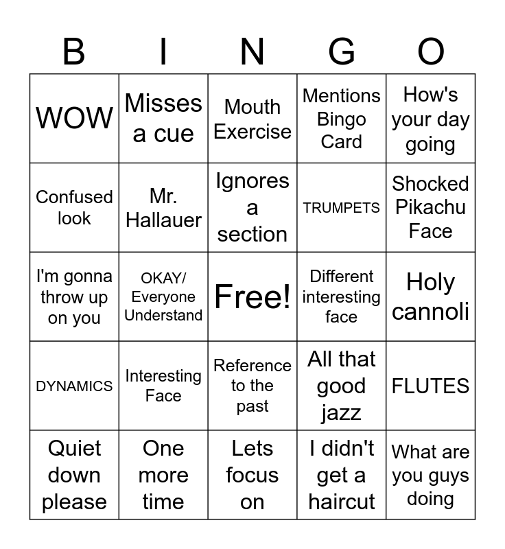 This bingo card has a free space and 24 words: Interesting Face, One more time, Ignores a section, Quiet down please, How's your day going, WOW, Confused look, Misses a cue, Different interesting face, Reference to the past, TRUMPETS, I'm gonna throw up on you, All that good jazz, FLUTES, Mr. Hallauer, I didn't get a haircut, Holy cannoli, Mouth Exercise, Shocked Pikachu Face, OKAY/ Everyone Understand, What are you guys doing, DYNAMICS, Mentions Bingo Card and Lets focus on.