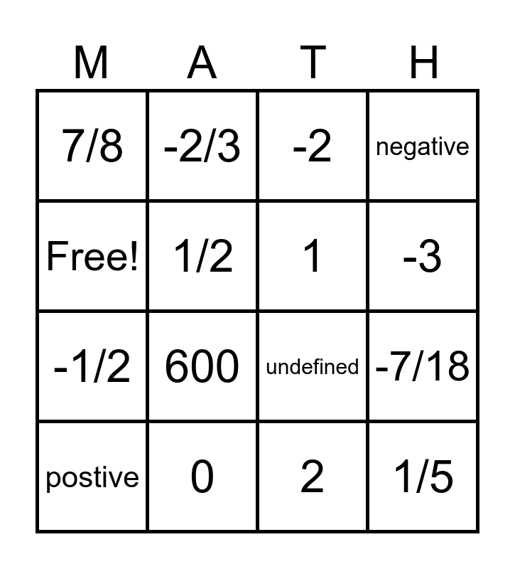This bingo card has 16 words: 0, -7/18, -2, 7/8, -1/2, -2/3, undefined, 2, Free!, 1/2, postive, negative, 600, -3, 1 and 1/5.