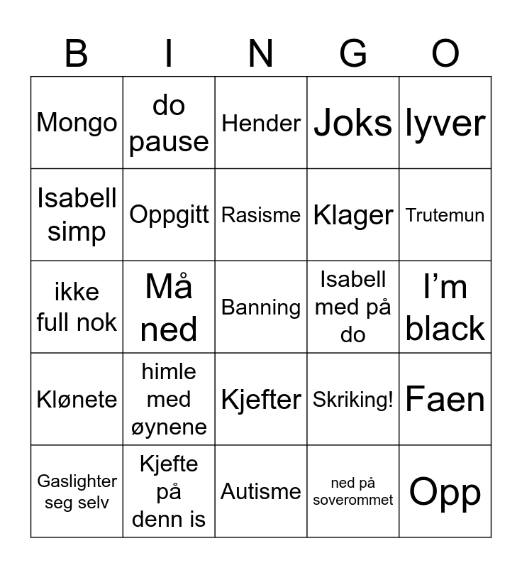 This bingo card has 25 words: himle med øynene, Autisme, Rasisme, Gaslighter seg selv, lyver, Mongo, Isabell simp, do pause, Isabell med på do, Kjefter, Klager, ikke full nok, Skriking!, Faen, Oppgitt, Opp, I’m black, Hender, Trutemun, Må ned, Banning, Kjefte på denn is, Klønete, Joks and ned på soverommet.
