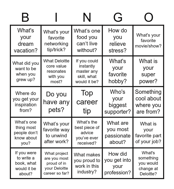 This bingo card has a free space and 24 words: What’s your favorite way to unwind after work?, What project are you most proud of in your Deloitte career so far?, If you could instantly master any skill, what would it be?, If you were to write a book, what would it be about?, What's your favorite movie/show?, What's your dream vacation?, What did you want to be when you grew up?, What's your favorite networking tip/trick?, Who's your biggest supporter?, What’s the best piece of advice you’ve ever received?, What's your favorite hobby?, Where do you get your inspiration from?, What are you most passionate about?, What is your favorite part of your job?, What Deloitte core value resonates with you most?, How did you get into your profession?, Something cool about where you are from?, What’s one food you can’t live without?, What is your super power?, Do you have any pets?, What's something you would change at Deloitte?, What’s one thing most people don’t know about you?, How do you relieve stress? and What makes you proud to work in this industry?.