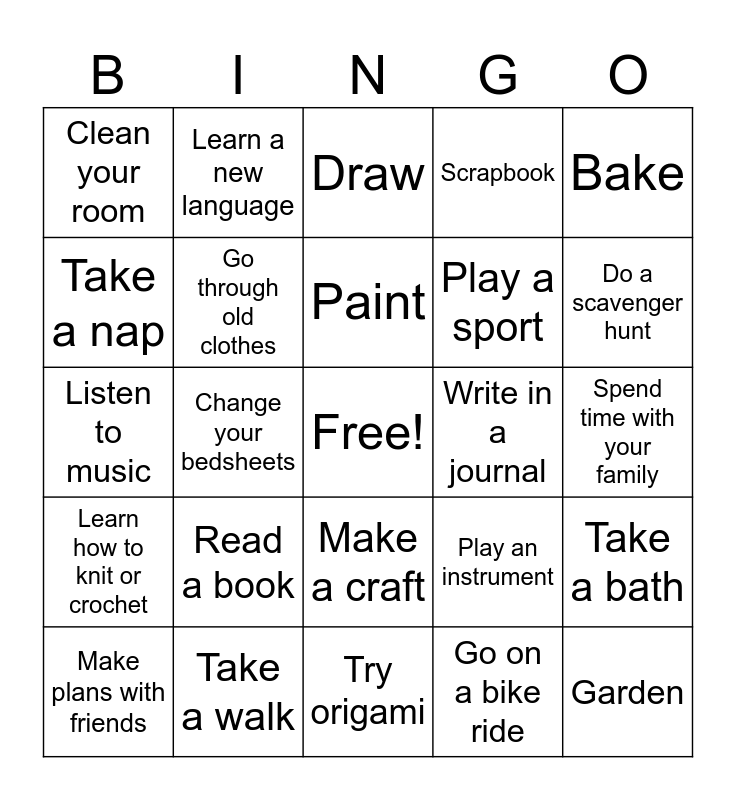 This bingo card has a free space and 24 words: Read a book, Take a walk, Paint, Make plans with friends, Bake, Clean your room, Take a nap, Learn a new language, Write in a journal, Make a craft, Play a sport, Listen to music, Play an instrument, Take a bath, Go through old clothes, Go on a bike ride, Spend time with your family, Draw, Do a scavenger hunt, Change your bedsheets, Garden, Learn how to knit or crochet, Scrapbook and Try origami.