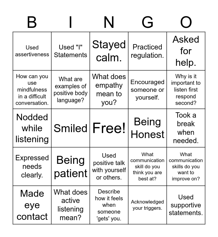 This bingo card has a free space and 24 words: Being patient, What does active listening mean?, What does empathy mean to you?, Made eye contact, Asked for help., Used assertiveness, How can you use mindfulness in a difficult conversation., Used "I" Statements, Being Honest, Used positive talk with yourself or others., Encouraged someone or yourself., Nodded while listening, What communication skill do you think you are best at?, What communication skills do you want to improve on?, What are examples of positive body language?, Acknowledged your triggers., Took a break when needed., Stayed calm., Why is it important to listen first respond second?, Smiled, Used supportive statements., Expressed needs clearly., Practiced regulation. and Describe how it feels when someone 'gets' you..